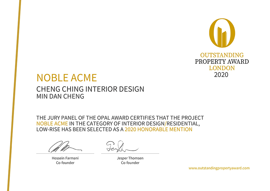 OUTSTANDING PROPERTY AWARD LONDON,OPAL(英國倫敦傑出地產大獎)由全球知名企業集團Farmani Group組織,並以招攬全球最佳建築師、室內設計師與房地產開發商為目標,在創造異業菁英聯合平台的同時,找尋各地最富創造力、革新感、社會影響力與永續性的設計方案。參與者有機會替自己最新穎的企劃博得國際能見度,並且和產業的先驅及專業人士進行交流。