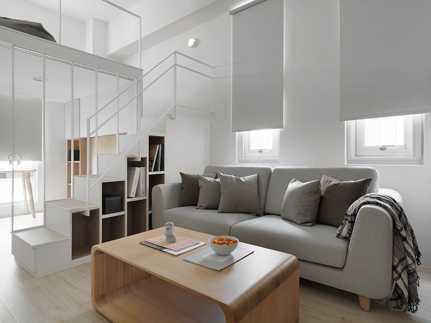 留白、減少收納區位,創造合宜的居住空間,在整合業主對於將來空間的夢想藍圖後,澄境設計 鄭抿丹 設計總監 除去量體內使空間狹隘且採光不佳的一面隔牆,並劃設使視覺效果挑高寬敞的夾層,於一室純白中創造專屬個人的樂園。