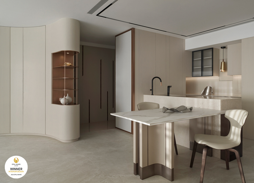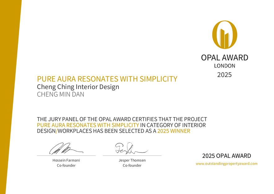OUTSTANDING PROPERTY AWARD LONDON,OPAL(英國倫敦傑出地產大獎)由全球知名企業集團Farmani Group組織,並以招攬全球最佳建築師、室內設計師與房地產開發商為目標,在創造異業菁英聯合平臺的同時,找尋各地最富創造力、革新感、社會影響力與永續性的設計方案。本屆賽事中,澄境設計 設計總監 鄭抿丹 帶來家宅《弧光柔藝》與商業空間《淨光敘簡》雙作參賽,前者透過寬縫片簾捕捉自然光影,使其在水泥灰地坪上隨時序流轉,整體米色基調搭配簡約線板勾勒出溫暖舒心的氛圍;後者則以大地色藝術漆與柔和弧形背牆,化解冷硬石材的距離感,並運用靈活玻璃隔間兼顧開放性與隱私需求。兩案皆深刻體現大賽所倡導的「創造力」核心理念,於國際設計舞臺上展現精湛實力,雙雙獲得「Winner」佳績!
