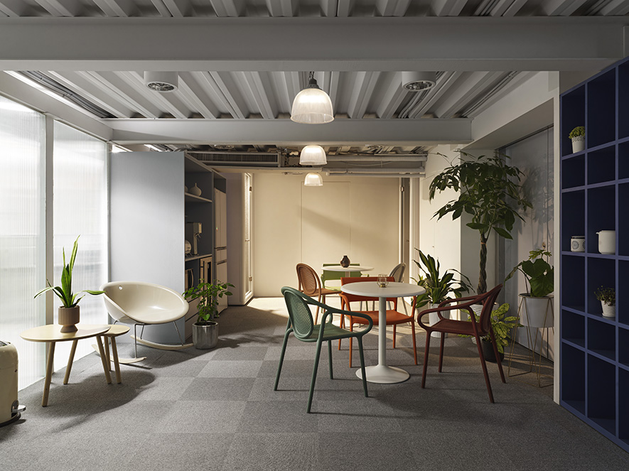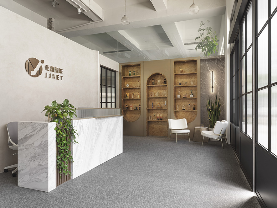 本案作為科技公司的總部,業主期望打破科技產業固有的冷硬形象,澄境設計 設計總監 鄭抿丹 遂以大地色系的藝術漆牆奠定穩雅基底,融合木質的柔和、金屬的俐落與皮革的精緻,層疊一番冷暖相容、帶有精細光澤與柔軟觸感的空間表情;配合紅藍綠對比色家具、自然垂墜綠植點綴,注入活潑生機之外,其豐富植栽亦在整體無甲醛建材與節能系統的基礎上,增強淨化空氣、調節溫濕作用,為員工創造健康舒適的綠色辦公環境,同時向到訪者傳遞企業應盡的社會責任與前瞻思維。