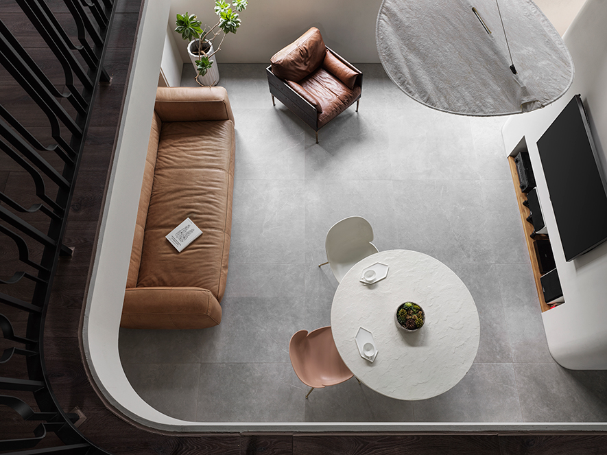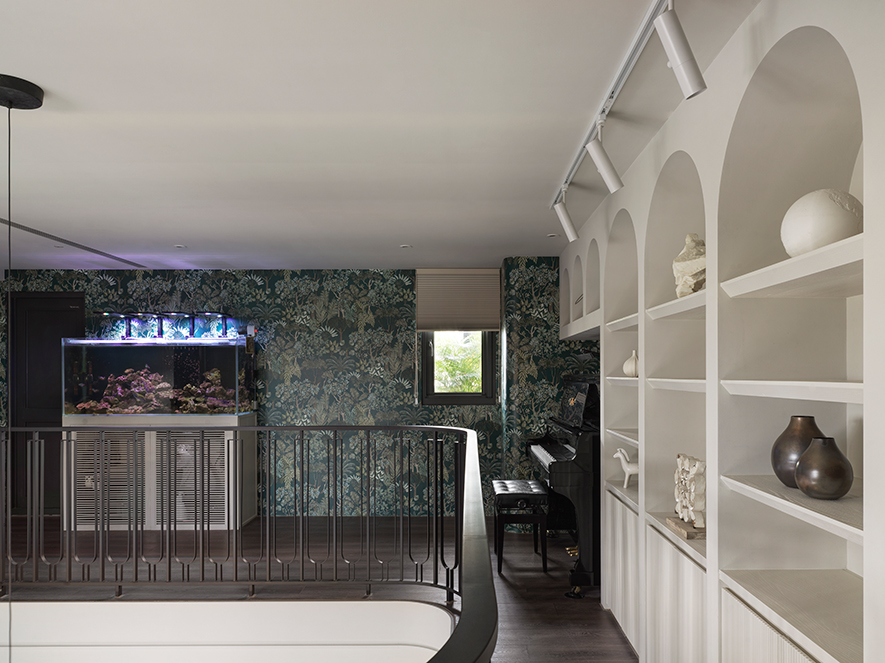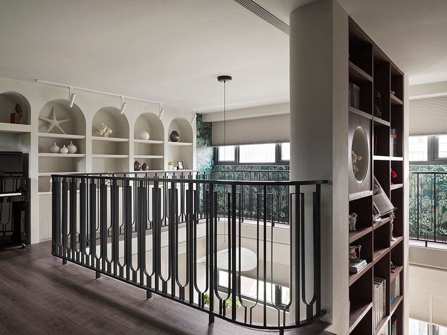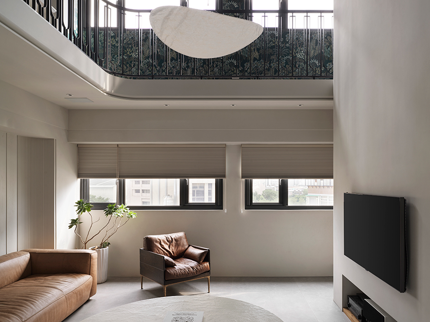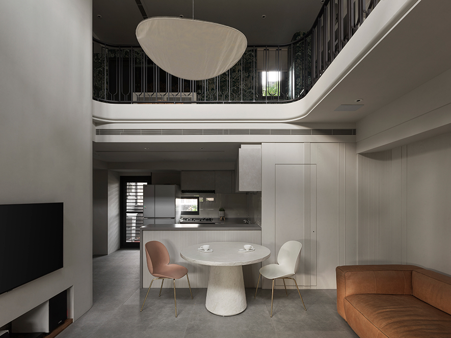 澄境設計 設計總監 鄭抿丹 為給予屋主夫妻及三名孩子雋永宜人的家園,遂以全室無毒綠建材扎穩安心生活的根基。隨後考量各人的興趣及習慣,活用樓梯位於電視牆後的立面空間,規劃頂天的書牆與收納區,提供男主人閱讀或彈奏吉他的隱密天地;二樓定位為孩童遊戲區,精心量測間距的訂製弧形欄杆,造型優美之餘確保兒童嬉戲時的安全;一旁則善用陽臺安置換水系統,實現女主人擁有海水魚缸的夢想。雙層開放設計令人們交流無虞,樂聲與笑語交織,譜寫一家人多采多姿的日常。