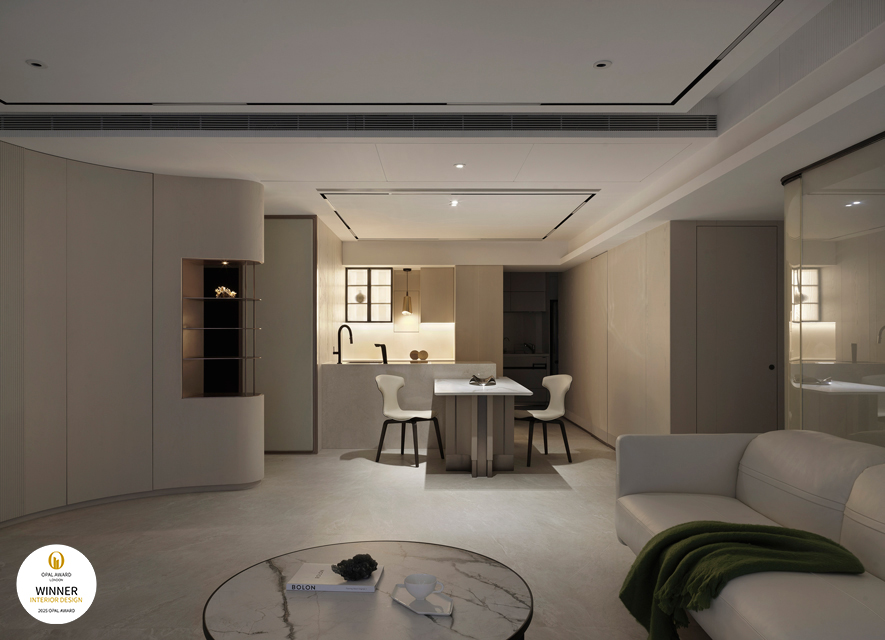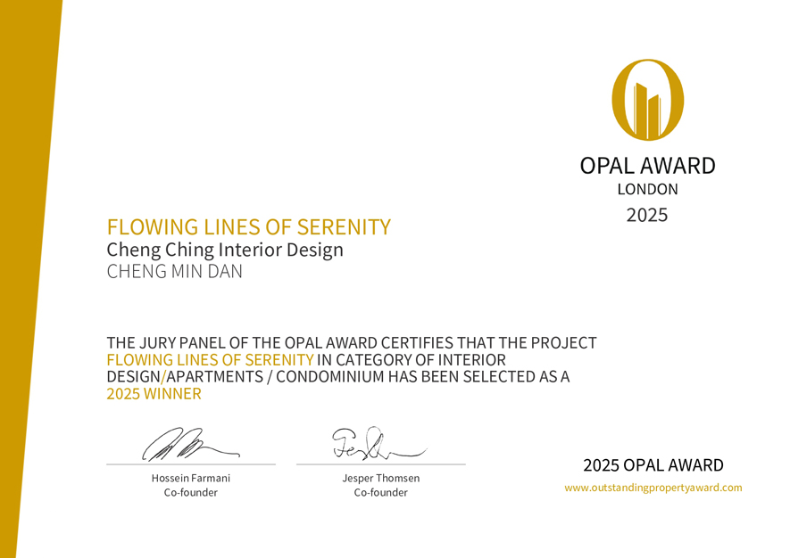 OUTSTANDING PROPERTY AWARD LONDON,OPAL(英國倫敦傑出地產大獎)由全球知名企業集團Farmani Group組織,並以招攬全球最佳建築師、室內設計師與房地產開發商為目標,在創造異業菁英聯合平臺的同時,找尋各地最富創造力、革新感、社會影響力與永續性的設計方案。本屆賽事中,澄境設計 設計總監 鄭抿丹 帶來家宅《弧光柔藝》與商業空間《淨光敘簡》雙作參賽,前者透過寬縫片簾捕捉自然光影,使其在水泥灰地坪上隨時序流轉,整體米色基調搭配簡約線板勾勒出溫暖舒心的氛圍;後者則以大地色藝術漆與柔和弧形背牆,化解冷硬石材的距離感,並運用靈活玻璃隔間兼顧開放性與隱私需求。兩案皆深刻體現大賽所倡導的「創造力」核心理念,於國際設計舞臺上展現精湛實力,雙雙獲得「Winner」佳績!