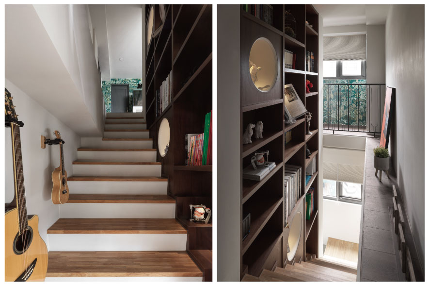 澄境設計 設計總監 鄭抿丹 為給予屋主夫妻及三名孩子雋永宜人的家園,遂以全室無毒綠建材扎穩安心生活的根基。隨後考量各人的興趣及習慣,活用樓梯位於電視牆後的立面空間,規劃頂天的書牆與收納區,提供男主人閱讀或彈奏吉他的隱密天地;二樓定位為孩童遊戲區,精心量測間距的訂製弧形欄杆,造型優美之餘確保兒童嬉戲時的安全;一旁則善用陽臺安置換水系統,實現女主人擁有海水魚缸的夢想。雙層開放設計令人們交流無虞,樂聲與笑語交織,譜寫一家人多采多姿的日常。